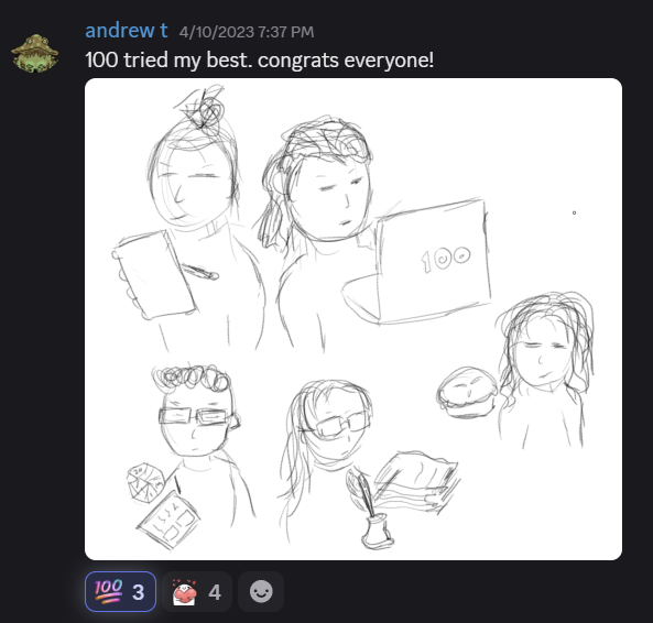 As part of a group challenge in 2023, a group of friends decided to do a 100 days challenge, where we would all commit to doing an art practice for 30~ minutes a day for the first 100 days of the year. I had always wanted to learn to draw, and I had a great experience learning from my friends, sharing daily, and feeling a forward momentum in my life.