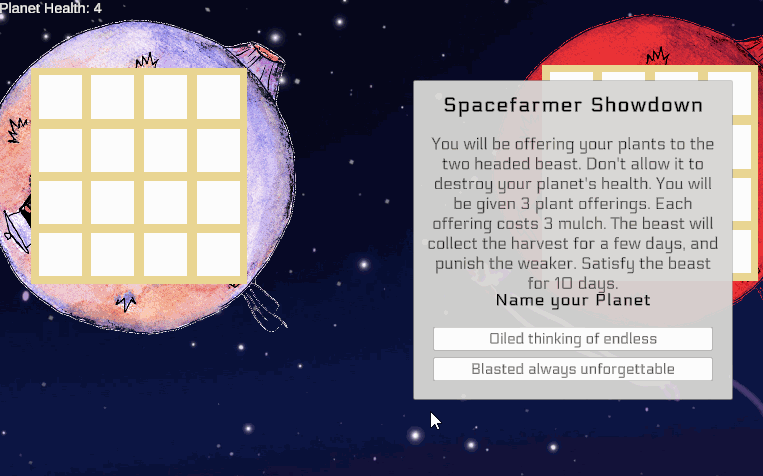 I had a faux pitch-night with some of my friends where I pitched 4 game ideas, and had them pick the one that seemed the most exciting. This was what Spacefarmer Showdown ended up being. We jammed it during TO Jam 2025, and had a somewhat playable prototype near the end, where you built a farm on your planet, and faced off against ghosts of other players to feed the space alien.